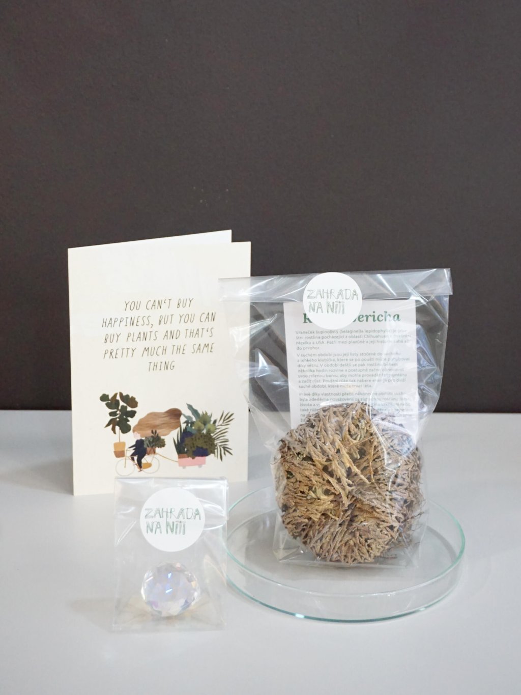 Růži z Jericha - nenápadná suchá rostlinka, která po zalití ožije, rozvine se a zazelená. Stačí ji položit na přiložený skleněný talířek, dolít trochu vody a pozorovat, jak se během pár hodin mění před očima. Po uschnutí se opět stočí do suchého klubíčka. Více o růži z Jericha v tomto článku.