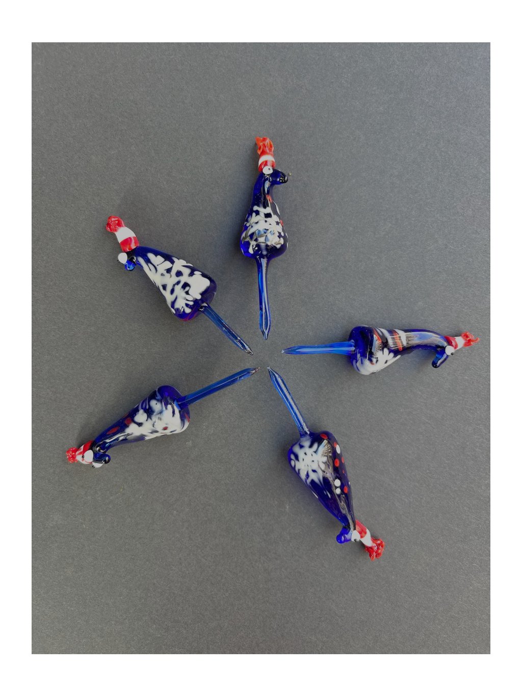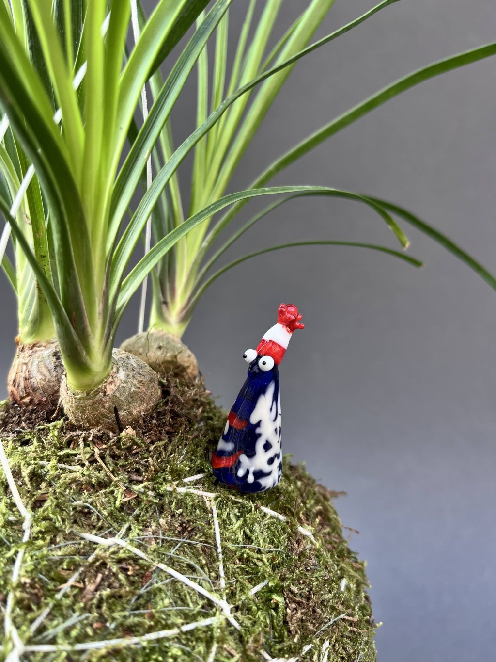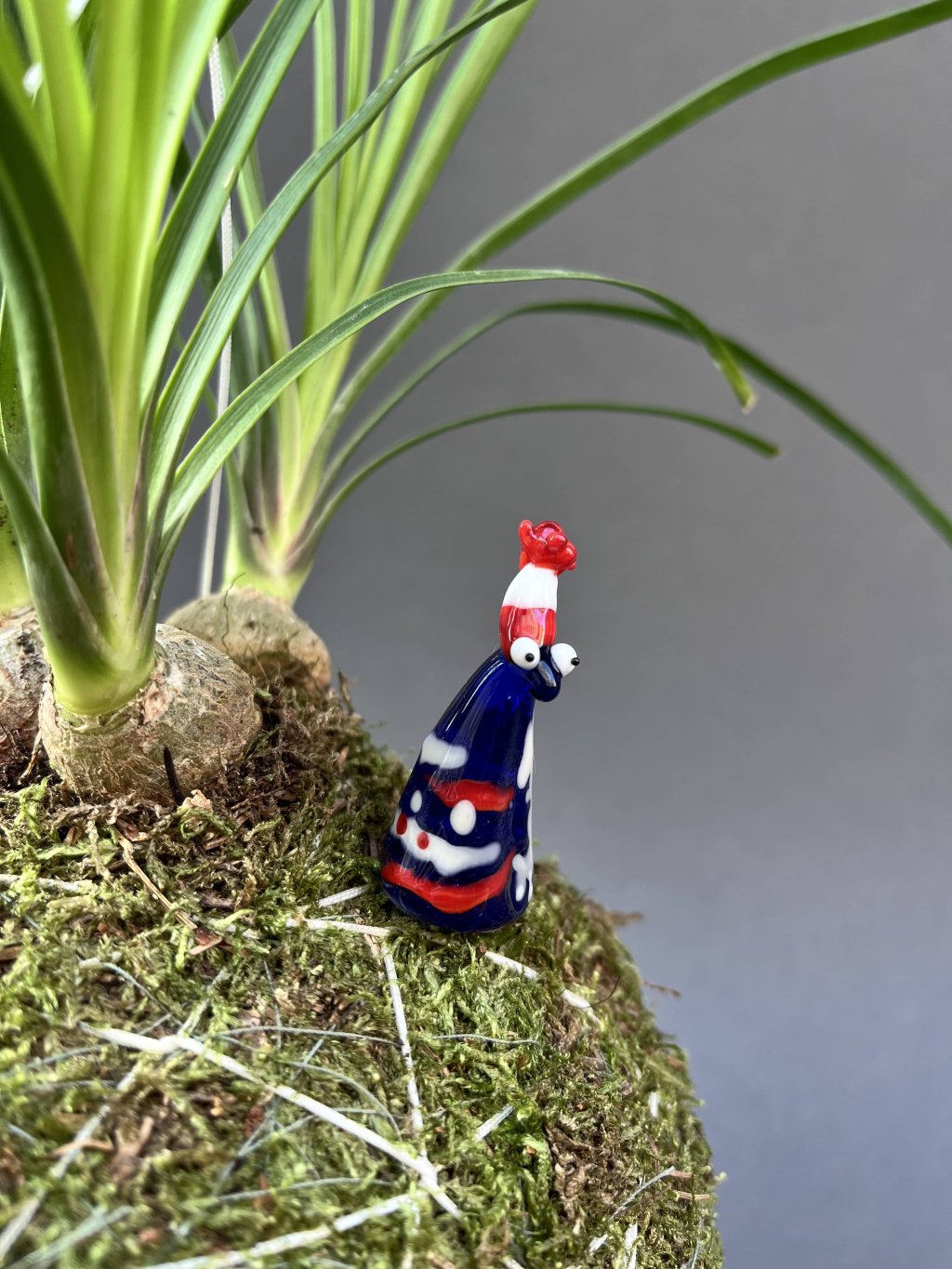 Vánoční čumilové pochází z dílny umělecké sklářky Hutunky. Jsou ručně vytvoření z barevného skla nad kahanem a jsou určení k zapíchnutí do kokedam. Z toho důvodu mají ve spodní části bodec, takže na kokedamách krásně drží. Můžete je ale zapíchnout třeba i do květináče s rostlinou nebo do vánočního věnce na dveře či stůl.