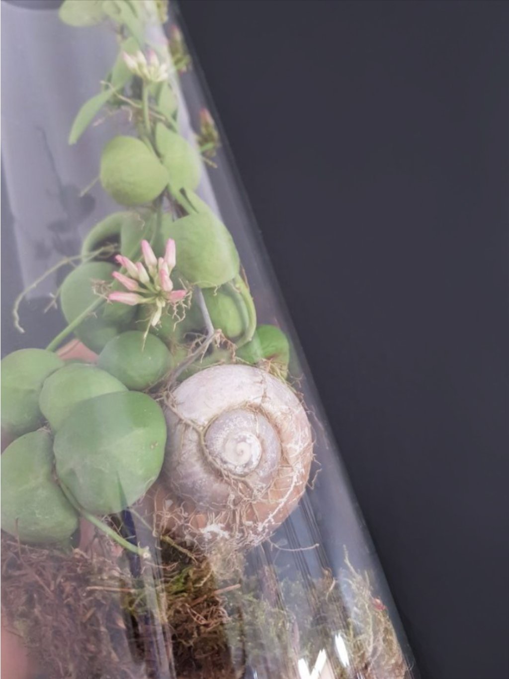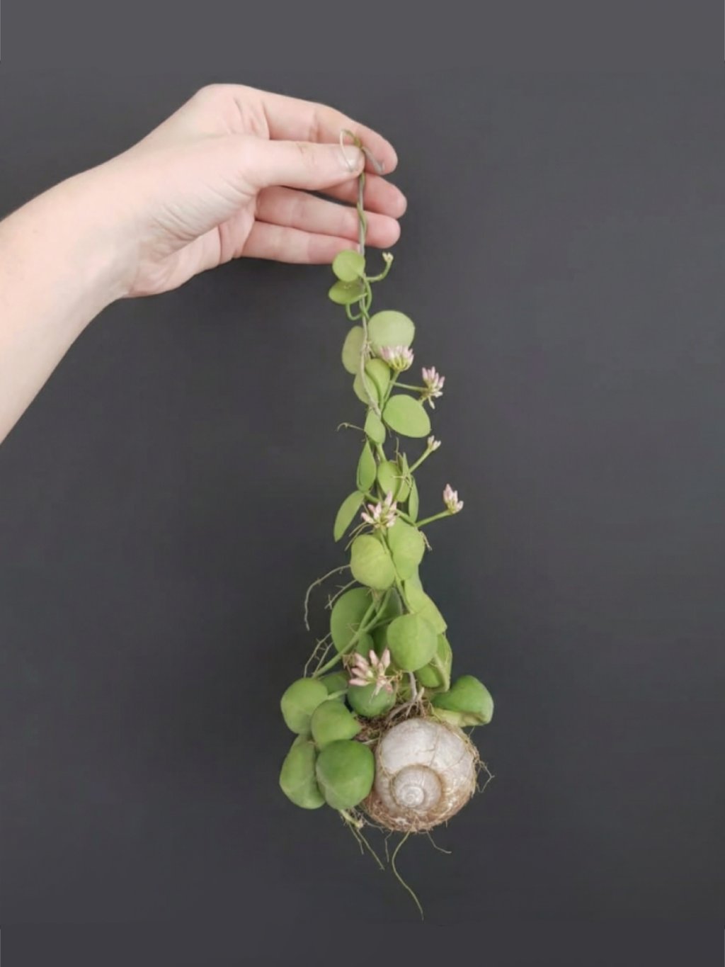 Dischidia je zasazena do šnečí ulity, které se sbírají v thajských rýžových polích, jako pozůstatky po zde žijcích měkkýších. Ulita je zavěšena na kovovém drátku, který zároveň slouží jako opora pro šlahouny liány.