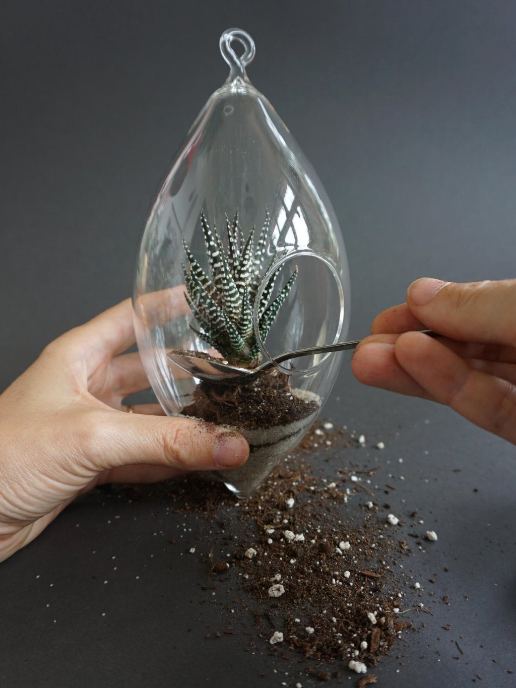 - Zálivku provádíme opatrně, nejlépe čajovou lžičkou, abychom dobře odhadli množství vody a sukulenty nepřelili. Jakmile totiž do aerária nalijete vody moc, už jí nedostanete ven a sukulenty by mohly uhnít.