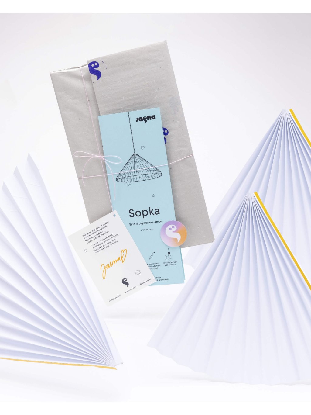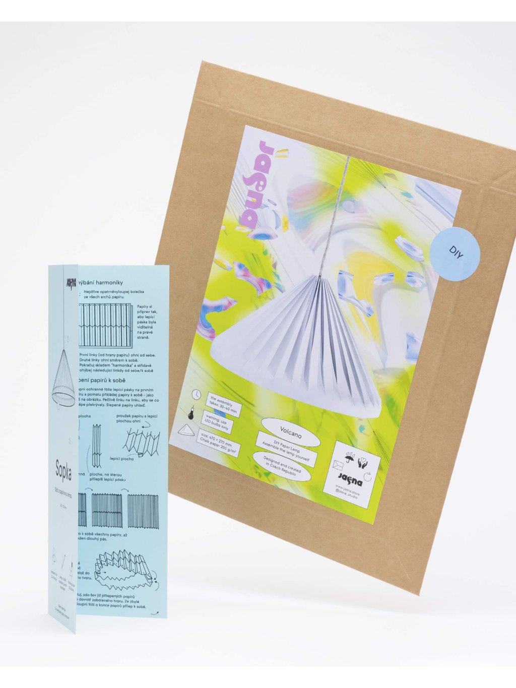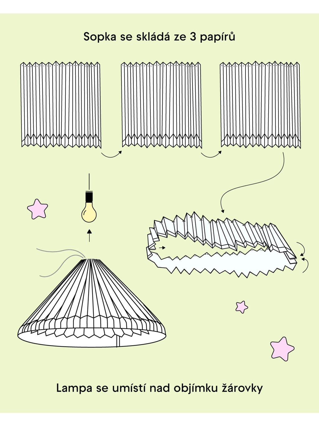 Tři archy ofsetové čtvrtky (200 g) jsou již předem nabigované, připravené ke složení. Sestavení je snadné podle přiloženého tištěného návodu nebo videonávodu, který najdete pomocí QR kódu na obalu. Nemusíte se bát, že byste stínidlo nesložili, sestavení zvládnou zručnější děti a úplní začátečníci.